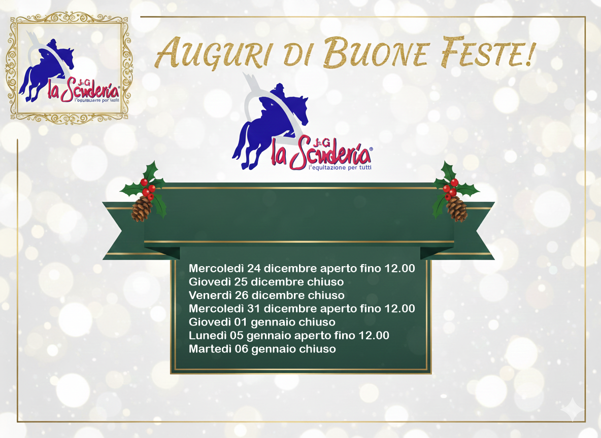 Comunichiamo gli orari per le feste natalizie: Mercoledì 24 dicembre aperto fino ore 12.00 Giovedì 25 dicembre chiuso Venerdì 26 dicembre chiuso Mercoledì 31 dicembre aperto fino ore 12.00 Giovedì 01 gennaio chiuso Lunedì 05 gennaio aperto fino ore 12.00 Martedì 06 gennaio chiuso